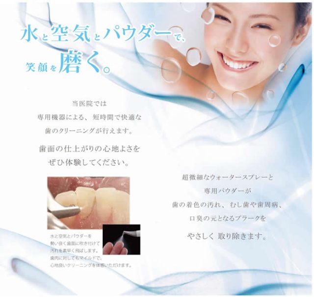溜まっているなかなか取れない細かい歯垢をスッキリ取ることにより口の中の細菌を減らすので、歯周病、虫歯の予防にもなります。ぜひこの機会にご体験ください。予約が詰まり次第終了となりますので、お早めにご予約お願いします。(エアフロー後にフッ素塗布ご希望の方は税込5500円になります)